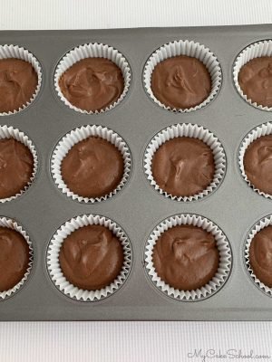 - Line cupcake pans with cupcake liners. Fill each liner with about ¼ cup of batter. Bake at 350°F for 18-20 minutes or until a toothpick can be inserted and removed with no crumbs or just a few crumbs sticking (or when the center springs back when gently touched).