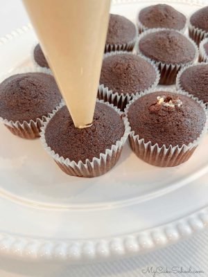 We also fill the inside of our cupcakes with frosting. This is optional. To do this, we insert a filled piping bag (with the tip cut off) into the top of each cupcake and push it halfway down, squeezing the bag for 2-3 seconds. (You can experiment if you have extra cupcakes, or just spray for 2-3 seconds onto a plate to get an idea of how much filling you’ll be putting in.)