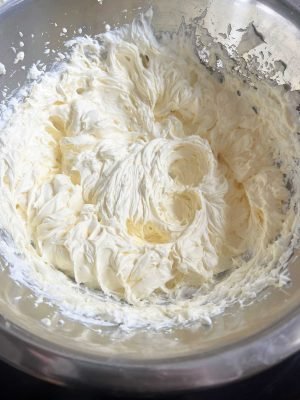 Krim kocok dikocok menjadi puncak yang kaku dengan mixer listrik (dinginkan mangkuk dan pemukul terlebih dahulu!) dan kemudian dicampur dengan campuran krim keju yang sudah dilembutkan, gula halus, ekstrak lemon, dan kulit lemon.